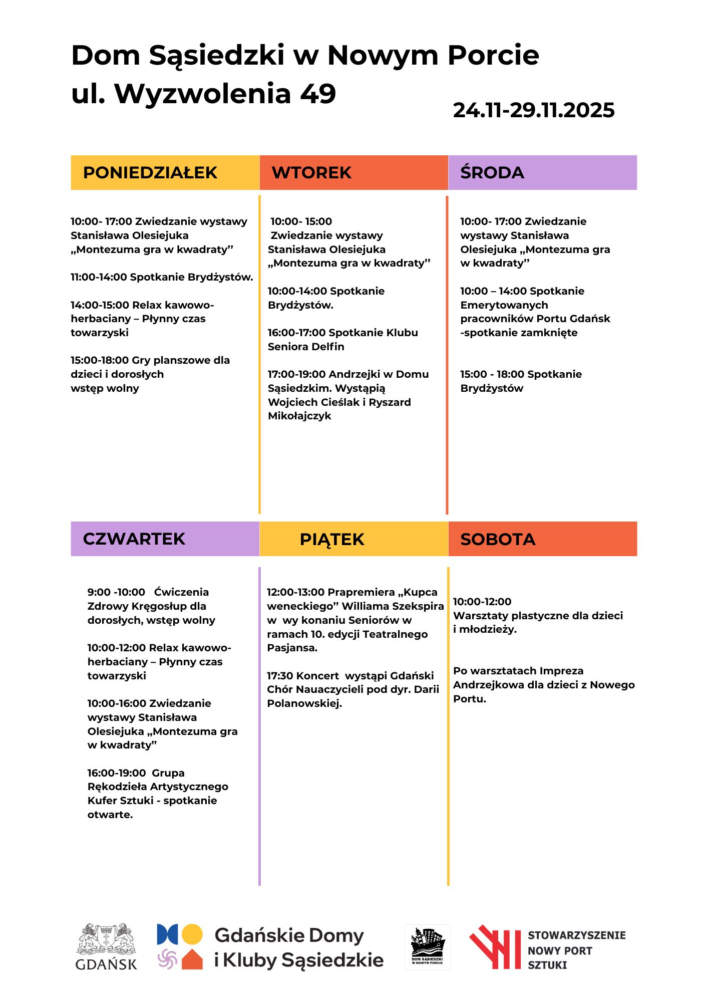 Przedstawiamy ostatni listopadowy plan zajęć w Domu Sąsiedzkim w Nowym Porcie.