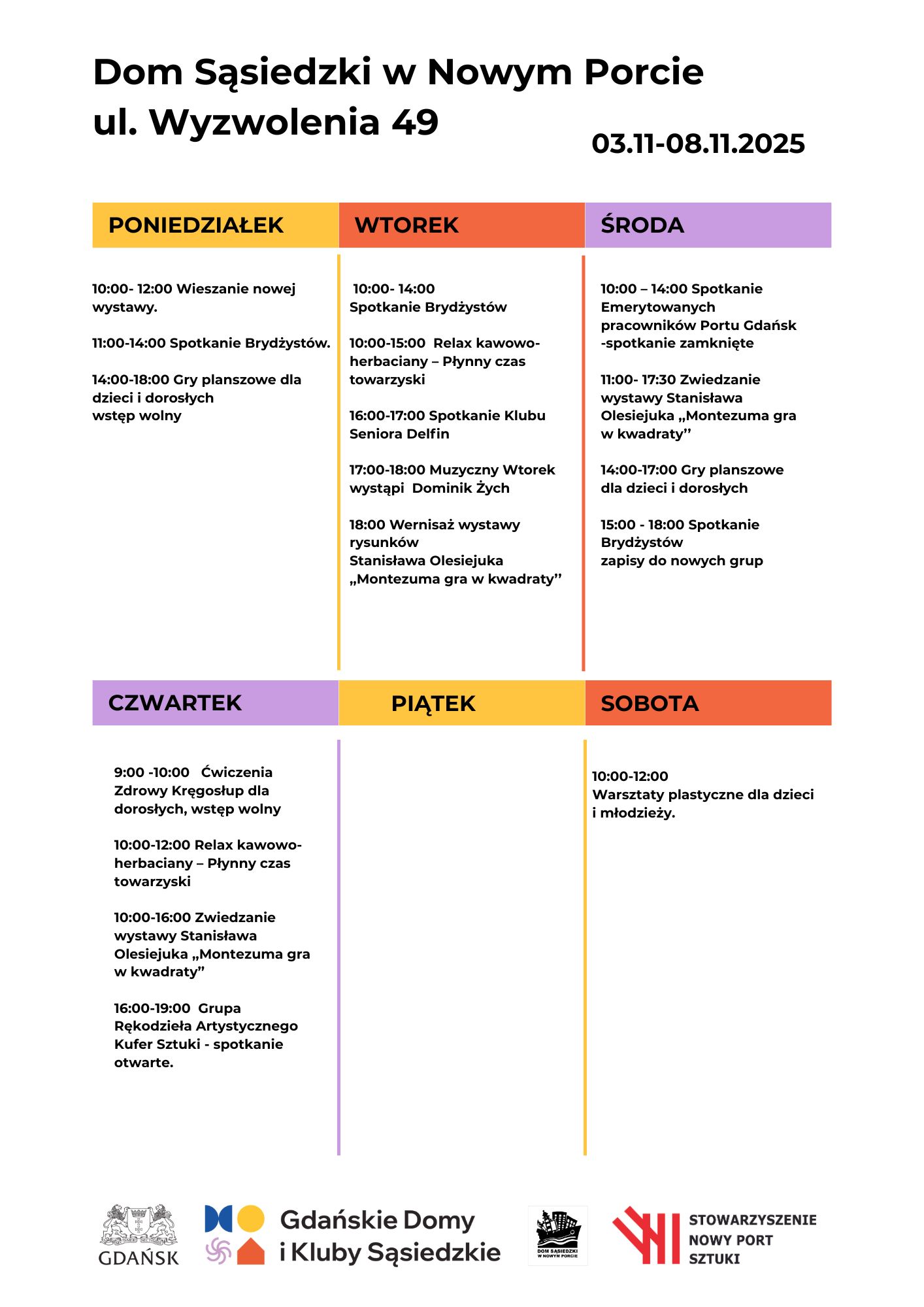 Harmonogram wydarzeń w Domu Sąsiedzkim 3.11-8.11 - Stowarzyszenie Nowy Port Sztuki