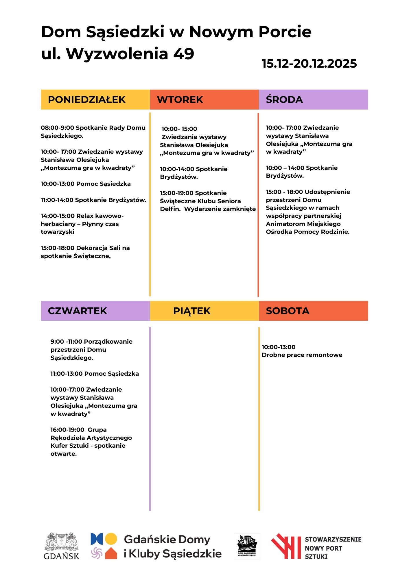 Harmonogram wydarzeń w Domu Sąsiedzkim w Nowym Porcie 15.12-20.12 - Stowarzyszenie Nowy Port Sztuki