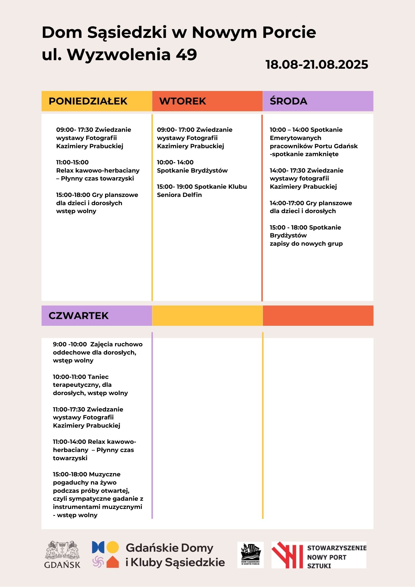 zapraszamy do uczestnictwa na najbliższych spotkaniach i wydarzeniach w Domu Sąsiedzkim w Nowym Porcie. Wstęp wolny