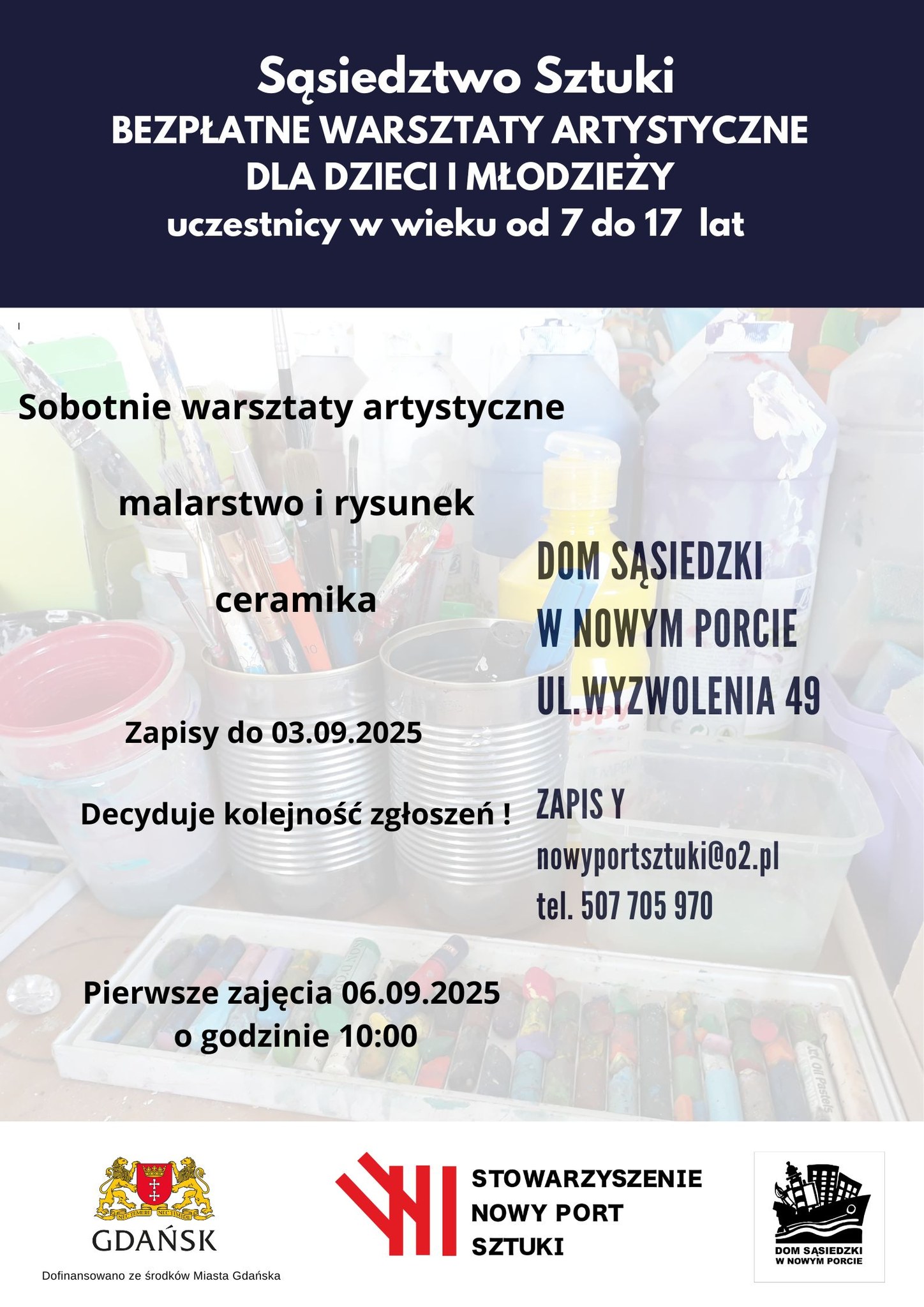Ruszamy z rekrutacją na bezpłatne warsztaty artystyczne dla dzieci i młodzieży. Zapraszamy chętnych w wieku 7-17 lat na warsztaty artystyczne z malarstwa i rysunku oraz ceramiki, które będą odbywać się w soboty w Domu Sąsiedzkim w Nowym Porcie przy ul. Wyzwolenia 49.
